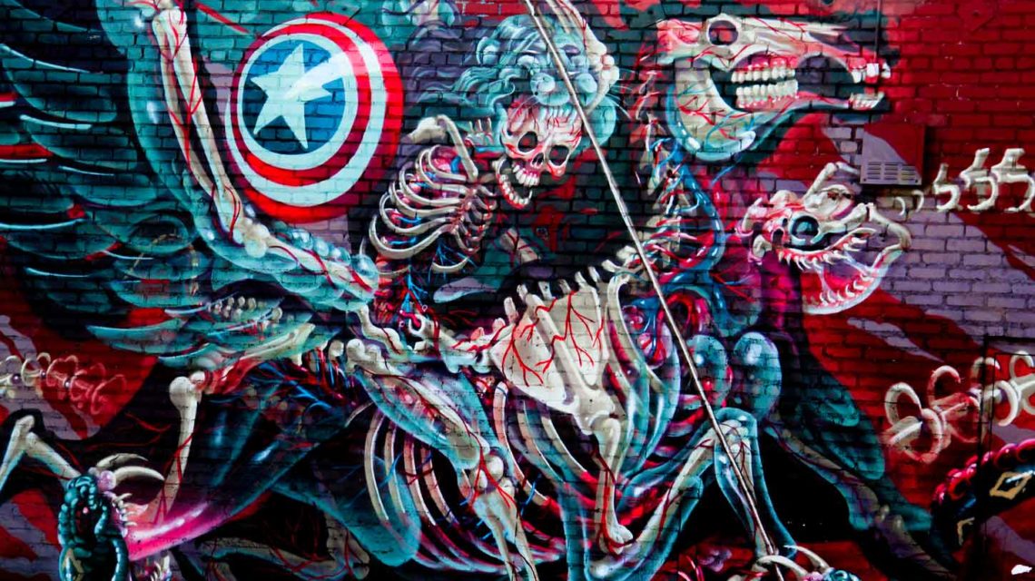 Nychos with a brilliant composition Downtown at The Container Yard. The masterpiece titled, “Captain Hercules Fighting Hydra,” shows an intricate skeletal warrior fighting off the Greek serpent with his Captain America-esque shield. Nychos is the founder of Rabbit Eye Movement (REM), located in the heart of Vienna. The art space is dedicated to the urban art movement, connecting and promoting a network of artists, both national and international, with a variety of backgrounds.
